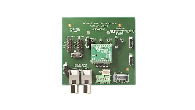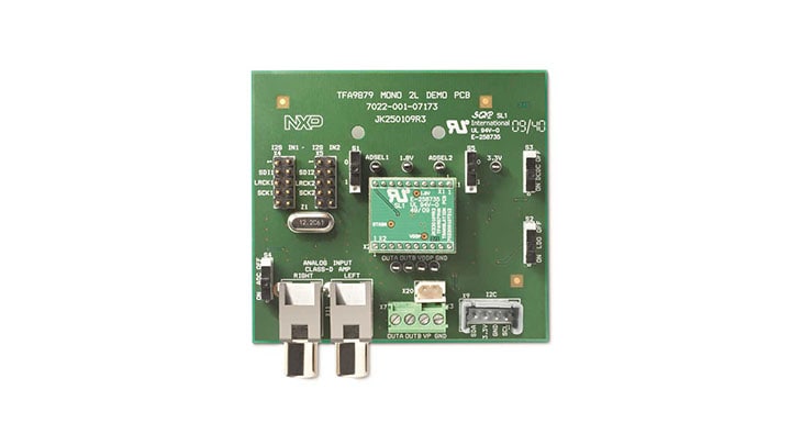 The demonstration PCB is designed to operate from a single supply with a wide supply voltage range of 2.5V - 5.5V delivering an output power up to 1.6WRMS in 8W Ω BTL or 2.7WRMS 4W Ω BTL. The application PCB area for the TFA9879 is very small because only three external components are required. The demo board is EMC compliant and contains 15kV ESD protections at the speaker output.