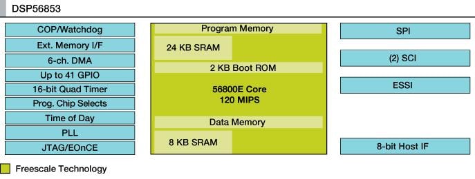 The DSP56853 is a member of the DSP56800E core-based family of digital signal controllers. This device combines the processing power of a DSP and the functionality of a microcontroller with a flexible set of peripherals on a single chip to create an extremely cost-effective solution. The DSP56853 includes peripherals that are especially useful for teledatacom devices, Internet appliances, portable devices, TAD, voice recognition, hands-free devices and general purpose applications.