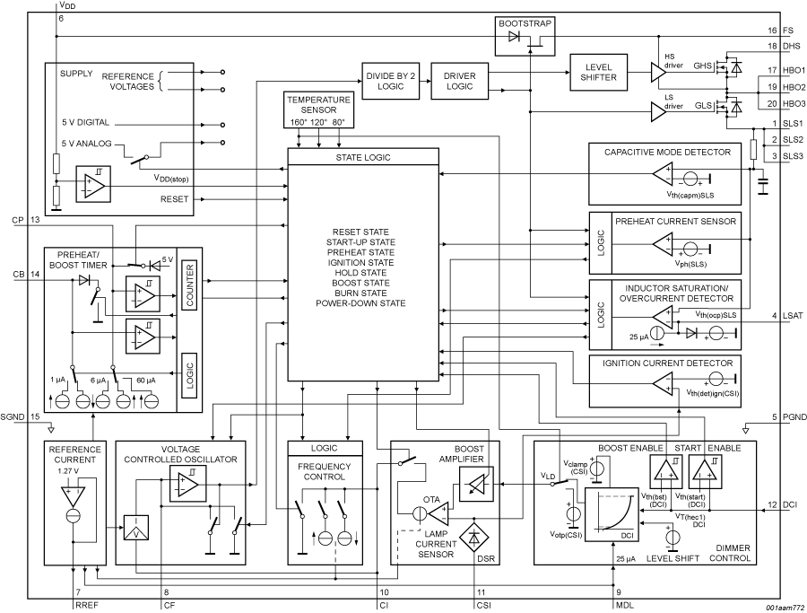The UBA20271 is a high voltage Power IC intended to drive and control high power self ballasted dimmable Compact Fluorescent Lamps (CFL) for 120V mains. The UBA20271 includes a half-bridge power circuit made up of two NMOST power FETs with advanced features for dimming and a lamp current controlled boost feature for boosting cold (amalgam) CFL lamps. The controller contains a half-bridge drive function, including a high voltage level-shift circuit with integrated bootstrap diode, an oscillator function, a current control function both for preheat and burn, timer function and protection circuits. The UBA20271 is supplied via a high-efficient dV/dt supply circuit.