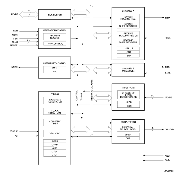 The operating mode and data format of each channel can be programmed independently. Additionally, each receiver and transmitter can select its operating speed as one of eighteen fixed baud rates, a 16× clock derived from a programmable counter/timer, or an external 1× or 16× clock. The baud rate generator and counter/timer can operate directly from a crystal or from external clock inputs. The ability to independently program the operating speed of the receiver and transmitter make the DUART particularly attractive for dual-speed channel applications such as clustered terminal systems.