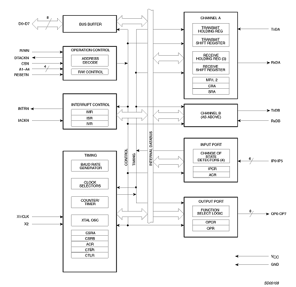 The Philips Semiconductors SCC68681 Dual Universal Asynchronous Receiver/Transmitter (DUART) is a single-chip MOS-LSI communications device that provides two independent full-duplex asynchronous receiver/transmitter channels in a single package. It is compatible with other S68000 family devices, and can also interface easily with other microprocessors. The DUART can be used in polled or interrupt driven systems. It is manufactured in a CMOS process.