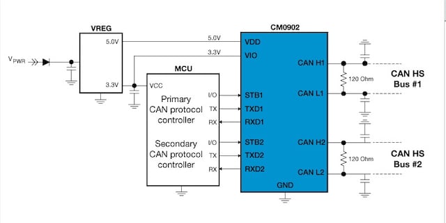 The NXP® MC34CM0902 dual CAN high-speed physical layer is a cost-effective product designed to target standard CAN high-speed applications requiring multiple transceivers. The transceivers are used to convert digital protocol information into analog CAN communication.