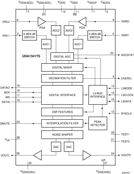 The UDA1341TS is similar to the UDA1340M and the UDA1344TS but adds features such as digital mixing of two input signals and one channel with a PGA and a digital AGC.