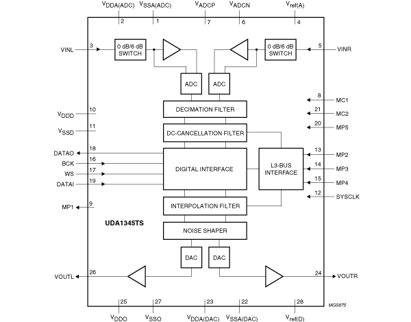 The UDA1345TS is a single-chip stereo Analog-to-Digital Converter (ADC) and Digital-to-Analog Converter (DAC) with signal processing features employing bitstream conversion techniques. The low power consumption and low voltage requirements make the device eminently suitable for use in low-voltage low-power portable digital audio equipment that incorporates recording and playback functions.