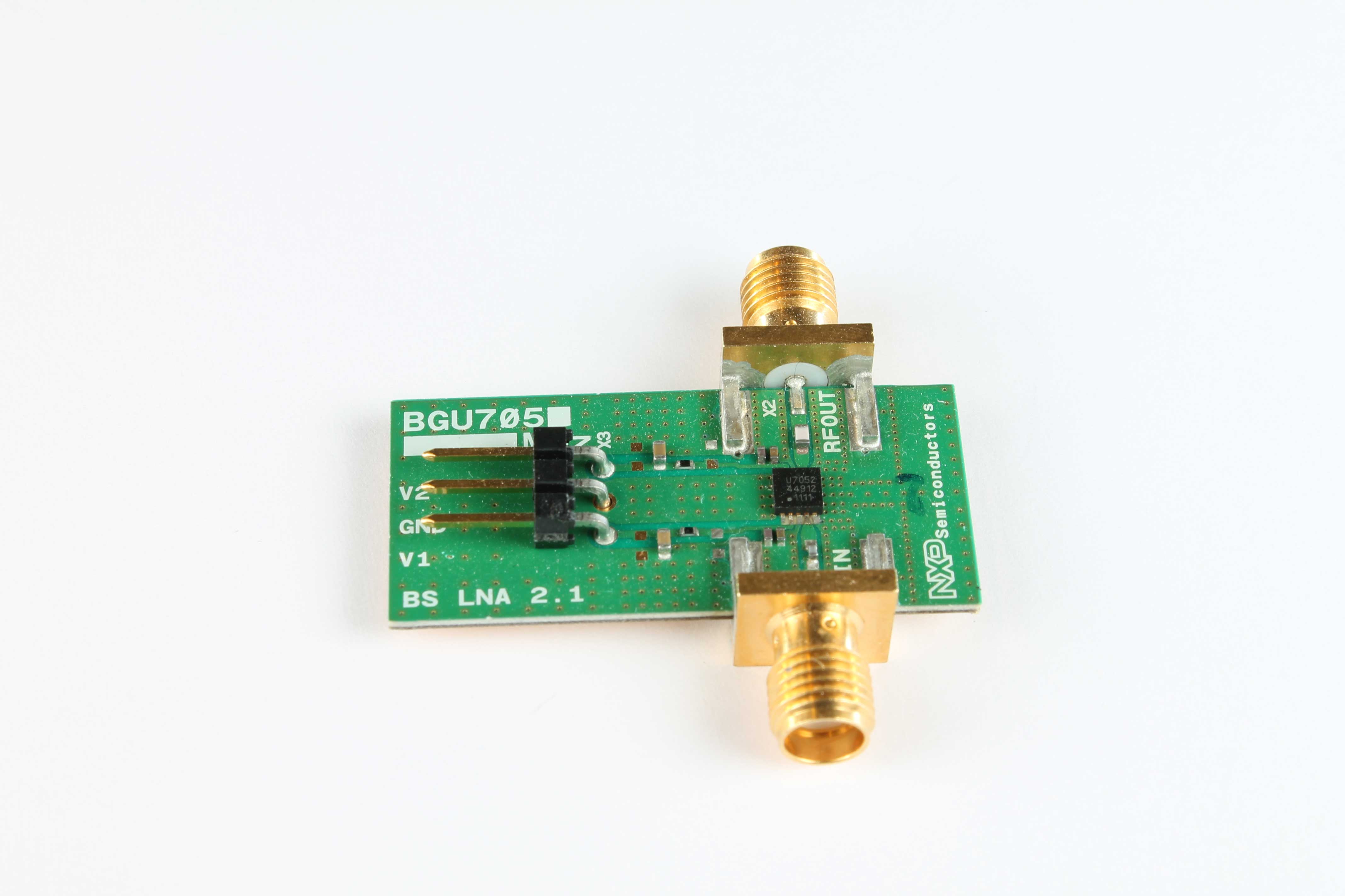 The BGU7051 LNA evaluation board simplifies the evaluation of the BGU7051. The BGU7051 is internally matched to 50 ohm and tuned for the 900 MHz frequency range. The evaluation board enables testing of the device performance and requires no additional support circuitry. The board is fully assembled with the BGU7051, including all the external components. The evaluation board is supplied with two SMA connectors for input and output connection to RF test equipment.