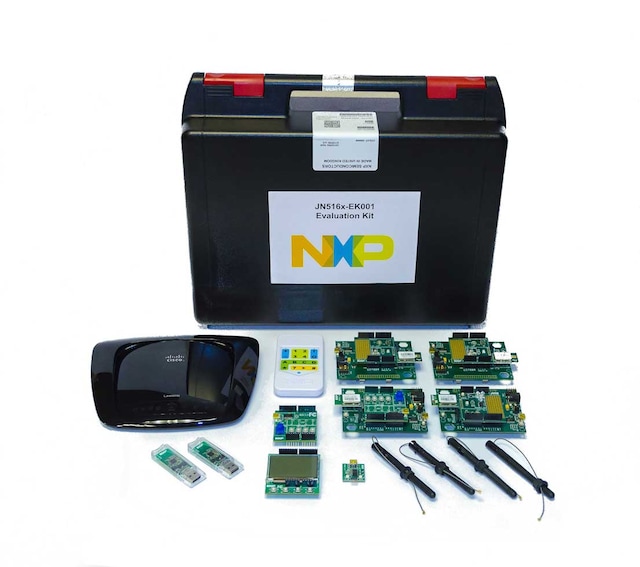 The NXP® JN516X-EK001 evaluation kit is specifically designed for use with the NXP JN516x series, a range of ultra-low-power, high-performance wireless microcontrollers suitable for JenNet-IP, RF4CE remote control and ZigBee applications. This comprehensive kit, which includes a series of wireless carrier boards, plug-in expansion boards, USB dongles, a remote control, a specially programmed Cisco router, and a complete software design kit, provides everything necessary for system development. The supplied router, which runs NXP OpenWRT firmware modified by NXP, makes it easy to develop solutions that include sensor-equipped objects as part of the "Internet of Things". Using the various demos included in the kit, designers can quickly produce demonstrators or proof-of-concept products. The same software can then be used for end products, using JN516X ICs or modules. Click here for support documentation.