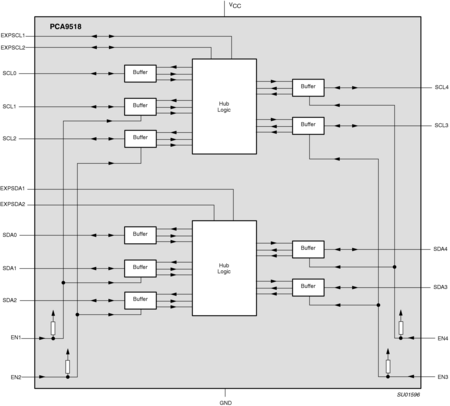 Using multiple PCA9518 parts, any width hub (in multiples of five)1can be implemented using the expansion pins.