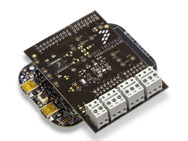 This FRDM evaluation board features the MPC17510, a monolithic H-Bridge designed to directly drive small Brushed DC-motors. Designed to easily fit on top of the FRDM-KL25Z.