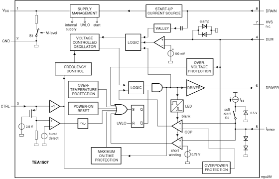 The proprietary high voltage BCD800 process makes direct start-up possible from the rectified mains voltage in an effective and green way. A second low voltage BICMOS IC is used for accurate, high speed protection functions and control.
