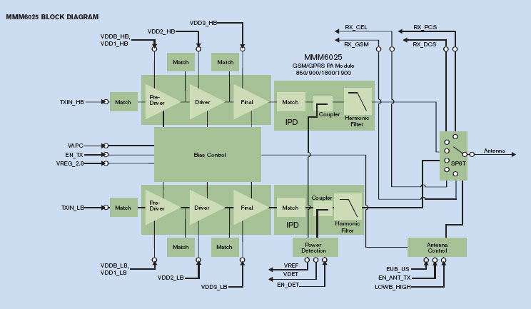 The MMM6025 is a 50-ohm, front-end power amplifier (PA) module for quad- and tri-band GSM handset applications, functioning over the GSM850, EGSM, DCS, and PCS transmit and receive frequency bands. It is compatible with GSM/GPRS Class 12 operating modes. To simplify radio front-end design requirements, NXP® Semiconductors's MMM6025 module has integrated power amplification, power coupling, power detection, low pass filtering and antenna switching functions.
