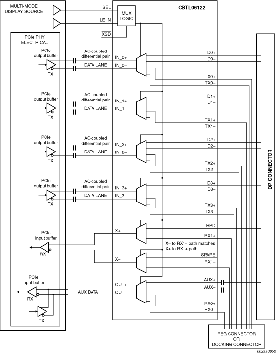 The CBTL06122 is a six-channel ('hex') multiplexer for DisplayPort and PCI Express Gen2 applications. It provides four differential channels capable of switching or multiplexing (bidirectional and AC-coupled) PCI Express Gen2 or DisplayPort signals, using high-bandwidth pass-gate technology. Additionally, it provides for switching/multiplexing of the Hot Plug Detect signal as well as the AUX or DDC (Direct Display Control) signals, for a total of six channels.
