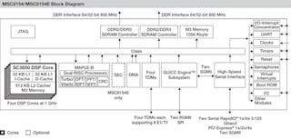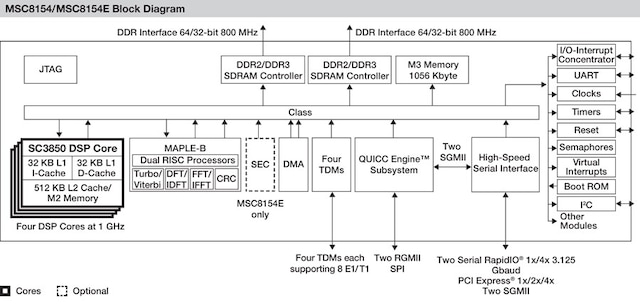 The MSC8154 DSP delivers a high level of performance and integration, combining four fully programmable new and enhanced SC3850 DSP cores, each running at up to 1 GHz with an architecture highly optimized for wireless infrastructure applications. Developed by NXP® and integrated on-chip, the MAPLE-B baseband accelerator supports hardware acceleration for Turbo and Viterbi channel decoding and for DFT/iDFT and FFT/iFFT algorithms and includes CRC processing. An internal RISC-based QUICC Engine® subsystem supports multiple networking protocols to guarantee reliable data transport over packet networks while significantly offloading processing from the DSP cores.