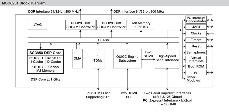 The MSC8251 DSP delivers a high level of performance and integration with a fully programmable SC3850 core running at up to 1 GHz. The SC3850 DSP core has been independently assessed to enable 40 percent more processing capability per MHz than the nearest DSP competition. A high performance internal RISC-based QUICC Engine® subsystem supports multiple networking protocols to guarantee reliable data transport over packet networks while significantly offloading processing from the DSP cores.
