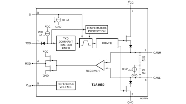 The TJA1050 is the interface between the Controller Area Network (CAN) protocol controller and the physical bus. The device provides differential transmit capability to the bus and differential receive capability to the CAN controller.