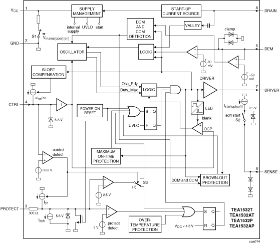 The GreenChip™II is the second generation of green Switched Mode Power Supply (SMPS) controller ICs. Its high level of integration allows the design of a cost effective power supply with a very low number of external components. The TEA1532(A)P; TEA1532(A)T can also be used in fixed frequency, Continuous Conduction Mode (CCM) converter designs for low voltage, high current applications. At low power (standby) levels, the system operates in cycle skipping mode which minimizes the switching losses during standby. The special built-in green functions allow the efficiency to be optimum at all power levels. This holds for quasi-resonant operation at high power levels, as well as fixed frequency operation with valley switching at medium power levels. At low power (standby) levels, the system operates in cycle skipping mode with valley detection.