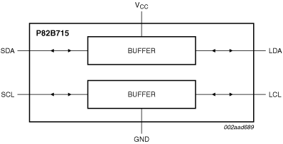 The P82B715 is a bipolar IC intended for application in IC-bus and derivative bus systems. While retaining all the operating modes and features of the IC-bus it permits extension of the practical separation distance between components on the I²C-bus by buffering both the data (SDA) and the clock (SCL) lines.