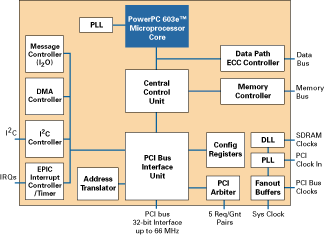 The MPC8240 Integrated Host Processor fits applications where cost, space, power consumption and performance are critical requirements. This device provides a high level of integration, reducing chip count from five discrete chips to one, thereby significantly reducing system component cost. High integration results in a simplified board design, less power consumption and faster time-to-market solution. This cost-effective, general-purpose integrated processor targets systems using PCI interfaces in networking infrastructure, telecommunications, and other embedded markets. It can be used for control processing in applications such as routers, switches, network storage applications and image display systems.