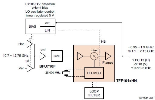 The TFF1017HN is an integrated downconverter for use in Low Noise Block (LNB) convertors in a 10.7 GHz to 12.75 GHz Ku band satellite receiver system.