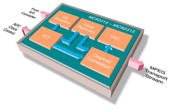 The MC92314 has been designed with system effectiveness in mind. Multi-path signals, interferences and many other artifacts need to be considered in a receiver design for DVB-T. The MC92314 combines a high-performance, active front end along with a precise FFT which allows the DVB-T system to operate normally under the worst conditions.
