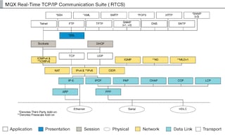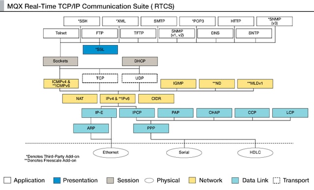 The IPv6 extension for MQX Real Time Communication Suite (RTCS) is an optional IPv6 add-on for MQX RTCS. It extends the RTCS TCP/IP stack to enable dual stack (IPv4 + IPv6) as well as single stack (IPv6 only or IPv4 only) operation. It has been architected to fit within the RTCS framework seamlessly, leveraging the IPv4 codebase whenever possible to minimize memory footprint.