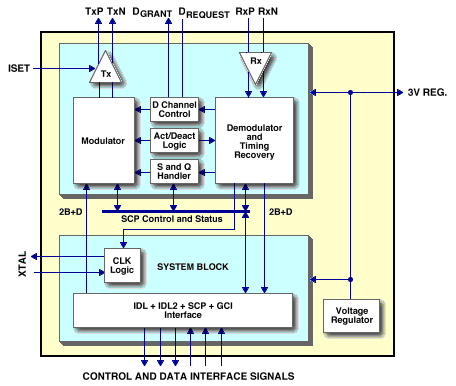 The Interchip Digital Link (IDL2) is supported for the exchange of 2B+D channel information between ISDN components and systems. Transceiver operation is programmed through the industry standard Serial Control Port (SCP). As an alternative to IDL+SCP combination, a General Circuit Interface (GCI) is provided.