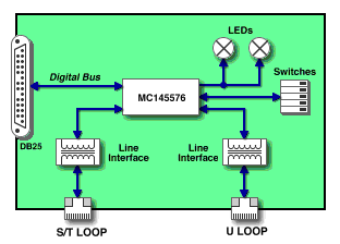 The device on the board may be configured in Basic NT1 mode, or as a Smart NT1, which provides terminal access to the MC145576 via IDL/SCP or GCI interfaces.