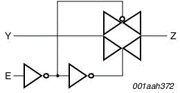Schmitt trigger action at the enable input (E) makes the circuit tolerant to slower input rise and fall times. A low input voltage threshold allows pin E to be driven by lower level logic signals without a significant increase in supply current ICC. This makes it possible for the NX3V1T66 to switch 4.3 V signals with a 1.8 V digital controller, eliminating the need for logic level translation.