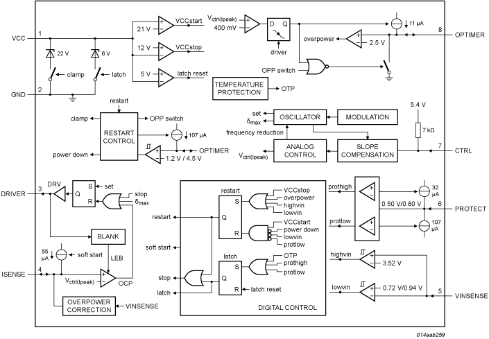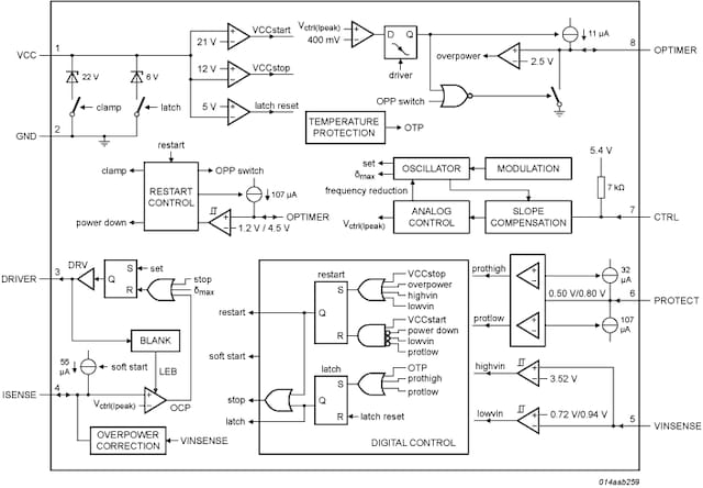 The TEA1733/38 family of IC´s are low cost Switched Mode Power Supply (SMPS) controller IC intended for flyback topologies. They operate in fixed frequency mode. To reduce ElectroMagnetic Interference (EMI), frequency jitter has been implemented. Slope compensation is integrated for Continuous Conduction Mode (CCM) operation.