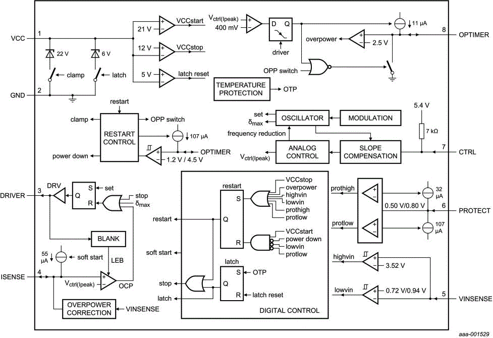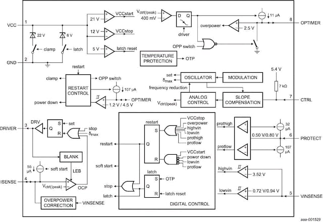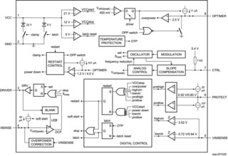 The TEA1733/38 family of IC´s are low cost Switched Mode Power Supply (SMPS) controller IC intended for flyback topologies. They operate in fixed frequency mode. To reduce ElectroMagnetic Interference (EMI), frequency jitter has been implemented. Slope compensation is integrated for Continuous Conduction Mode (CCM) operation.