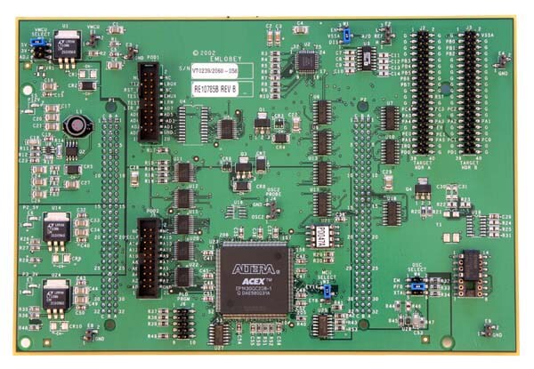The EM attaches to either development system (MMDS, MMEVS, or FSICE) through two expansion connectors located on the bottom side of the EM board. Connection to your target system is then made through a separately purchased target cable and target head adapter that attaches to a target connector located on the top side of the EM board. In addition to the target connector, each EM includes a connector which provides the ability to interface the EM to a logic analyzer for external hardware trace of code execution.
