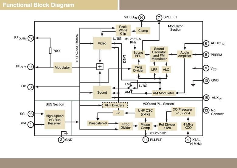 A programmable, internal Phase-Lock Loop (PLL), with an on-chip, cost-effective tank covers the full UHF range. The modulators incorporate a programmable, on-chip, sound subcarrier oscillator that covers all broadcast standards. No external tank circuit components are required, reducing PCB complexity and the need for external adjustments. The PLL obtains its reference from a cost-effective 4 MHz crystal oscillator.