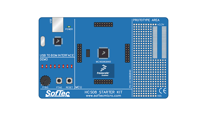 The PK-HCS08GB60 Starter Kit has been designed for the evaluation of the MC9S08GB60 microcontroller and the debugging of small user applications. The Starter Kit takes advantage of the CodeWarrior® Integrated Development Environment (which groups an Editor, Assembler, C Compiler and Debugger) and the NXP® BDM interface, which allows the download and debug of the user application into the microcontroller FLASH memory. Together with CodeWarrior®, the Starter Kit provides you with everything you need to write, compile, download, in-circuit emulate and debug user code. Full-speed program execution allows you to perform hardware and software testing in real time. The Starter Kit is connected to the host PC through a USB port. A prototyping area allows you to wire your own small application.