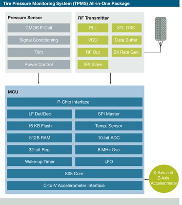 NXP’s MPXY8300 tire pressure monitoring system (TPMS) chipset is designed to enable a timely warning to the driver in the case of under-inflated or over-inflated tires on cars, trucks or buses—even while in motion. It is the first of its kind to offer capacitive sensor technology and full integration of a pressure sensor, an 8-bit S08 microcontroller (MCU), a radio frequency (RF) transmitter and x- and z-axis accelerometers in one package.