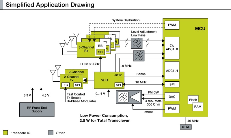 The MR2001 is a high-performance 77 GHz radar transceiver. It is scalable for multi-channel operation enabling a single radar platform with electronic beam steering and wide field-of-view to support long, mid-, and short-range radar applications for auto safety, communications infrastructure, and industrial systems. The MR2001 supports fast modulation with simultaneous channels enabling spatial resolution and detection accuracy across a wide field-of-view and consumes minimal power. When combined with the MPC577xK MCU, it offers a complete system-level radar solution for ADAS applications.
