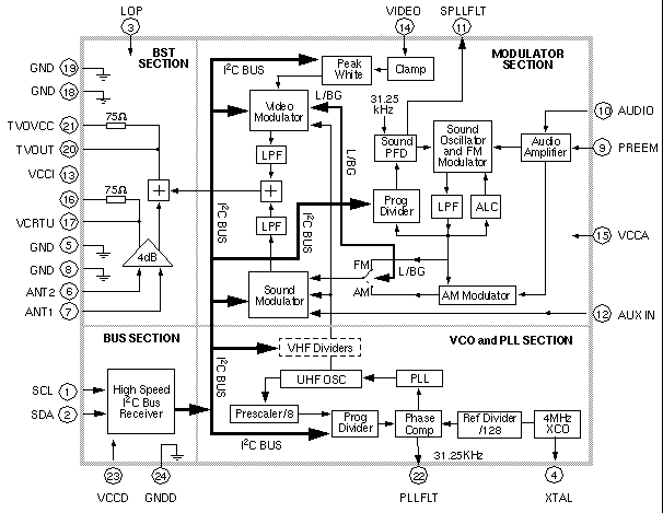 An on-chip high-speed I²C compatible bus receiver sets the channel. It is tuned by a PLL over the full range of the UHF bands. The modulator incorporates a sound subcarrier oscillator and uses a second PLL to derive 4.5, 5.5, 6.0, and 6.5 MHz subcarrier frequencies, which are selectable using the bus.