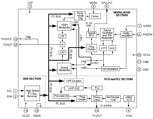 An on-chip high-speed I2C compatible bus receiver sets the channel. It is tuned by a PLL over the full range of the UHF bands. The modulator incorporates a sound subcarrier oscillator and uses a second PLL to derive 4.5, 5.5, 6.0, and 6.5 MHz subcarrier frequencies, which are selectable using the bus.
