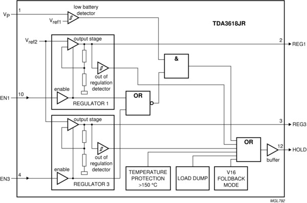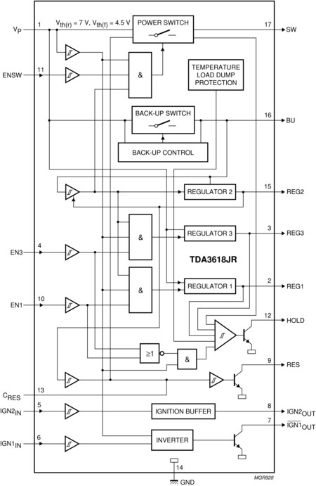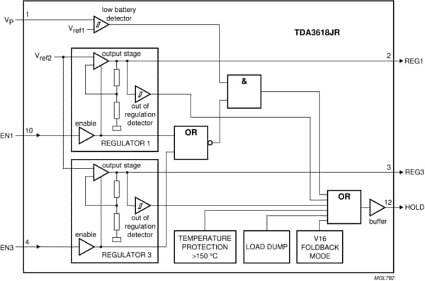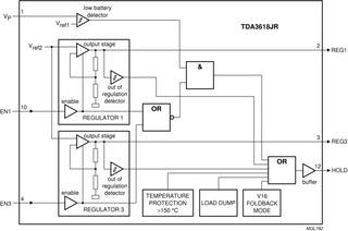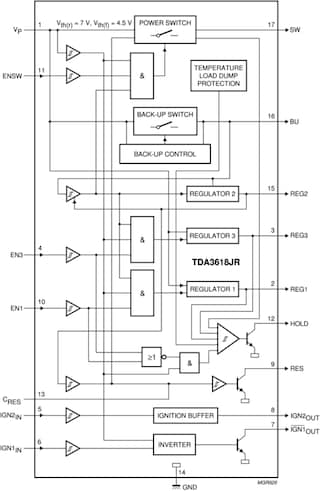 The TDA3618JR is a multiple output voltage regulator with a power switch and ignition buffers, intended for use in car radios with or without a microcontroller. It contains: