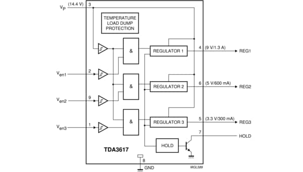 The TDA3617 is a multiple output voltage regulator with three independent regulators. It contains: