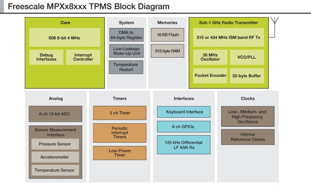 The MPXx85/86xxD is a sensor for use in applications that monitor tire pressure and temperature. It contains the pressure and temperature sensors, a Z-axis or an XZ-axis accelerometer, a MCU, an LF receiver and an RF transmitter all within a single package.
