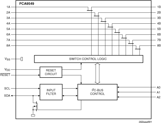 The PCA9549 provides eight bits of high speed TTL-compatible bus switching controlled by the I²C-bus. The low ON-state resistance of the switch allows connections to be made with minimal propagation delay. Any individual A to B channel or combination of channels can be selected via the I²C-bus, determined by the contents of the programmable Control register. When the I²C-bus bit is HIGH (logic 1), the switch is on and data can flow from Port A to Port B, or vice versa. When the I²C-bus bit is LOW (logic 0), the switch is open, creating a high-impedance state between the two ports, which stops the data flow.