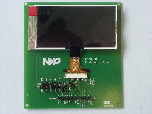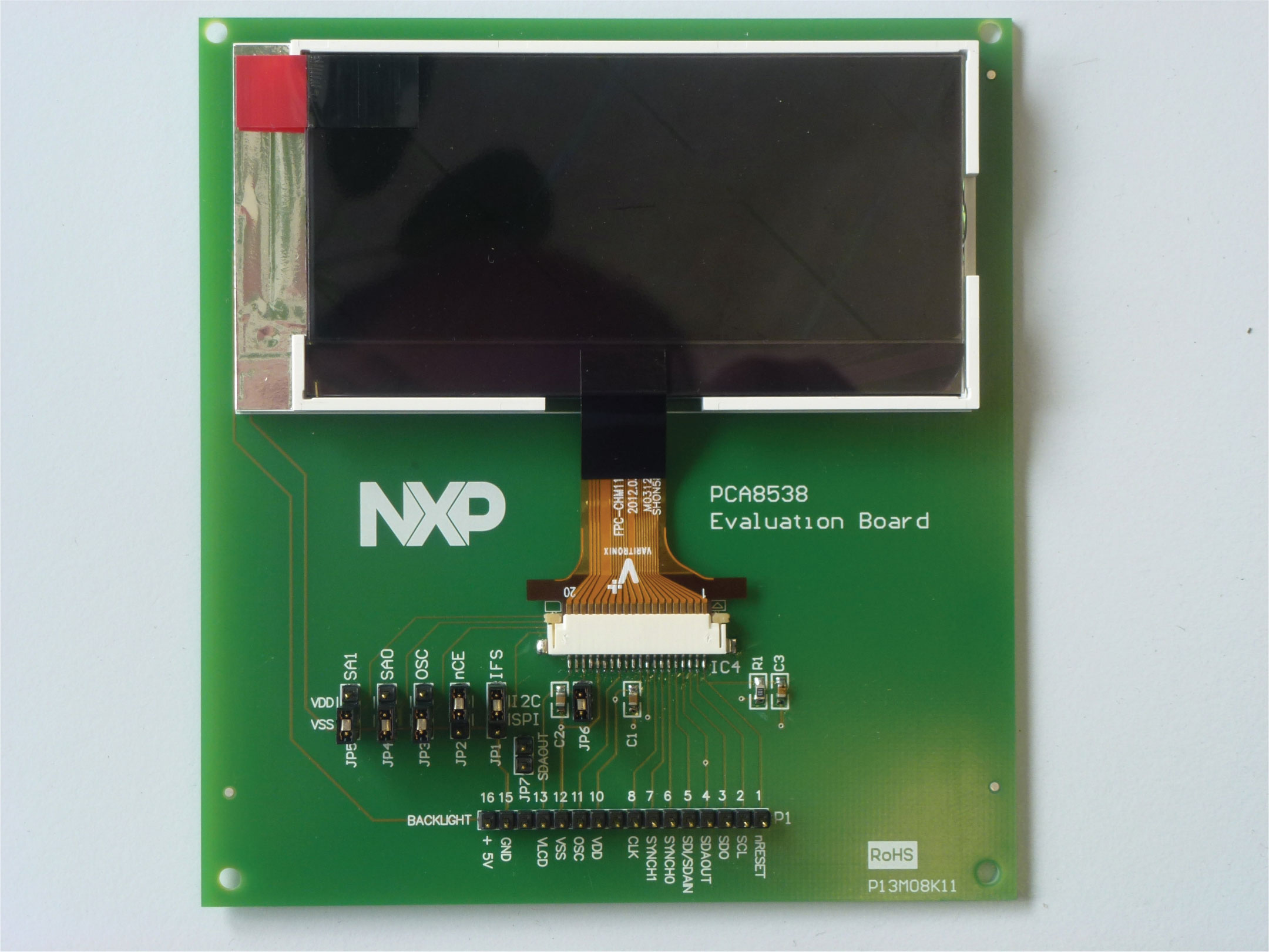 This board was developed in orde to provide a tool for engineers, wishing to demonstrate and evaluate this LCD driver, and to get hands-on experience with writing code for it. Code written using this board can serve as an example for the final application. This enables rapid prototyping. The board can be connected to any existing application with either I²C-bus or SPI-bus interface. This application then needs to provide also the power supply, with the supply voltage ranging from 2.5 V to 5.5 V.