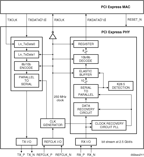 The PX1011B is a 2.5 Gbit/s PCI Express PHY with 8-bit data PXPIPE interface. Its PXPIPE interface is a superset of the PHY Interface for the PCI Express (PIPE) specification, enhanced and adapted for off-chip applications with the introduction of a source synchronous clock for transmit and receive data. The 8-bit data interface operates at 250 MHz with SSTL_2 signaling. The SSTL_2 signaling is compatible with the I/O interfaces available in FPGA products.
