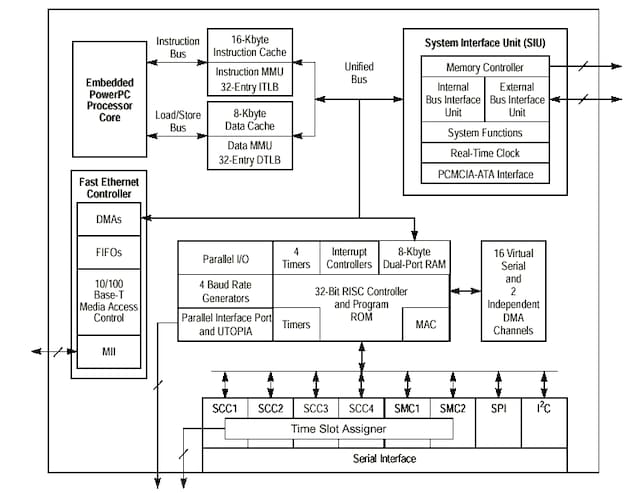 The MPC862 is a Power Architecture-based derivative of NXP® Semiconductors' MC68360 Quad Integrated Communications Controller (QUICC™). The embedded CPU on the MPC862 is a 32-bit processor (the MPC8xx core) that is built on Power Architecture and incorporates memory management units (MMUs) and instruction and data caches. The communications processor module (CPM) from the MC68360 QUICC has been enhanced by the addition of the inter-integrated controller (I²C) channel. The memory controller has been enhanced, enabling the MPC862 to support any type of memory, including high-performance memories and new types of DRAMs. A PCMCIA socket controller supports up to two sockets. A real-time clock has also been integrated.
