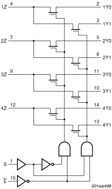 It has a digital select input (S), four independent inputs/outputs (nY0, nY1), a common input/output (nZ) and an active LOW enable input (E). When pin E is HIGH, the switch is turned off.