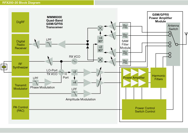 Our RFX250-20 RF Subsystem is a highly integrated, comprehensive radio solution GSM and GPRS terminals. This solution offers antenna-to-bits functionality using less than 250 mm2 of valuable board space.
