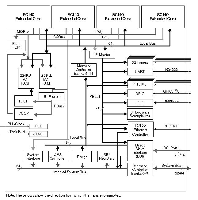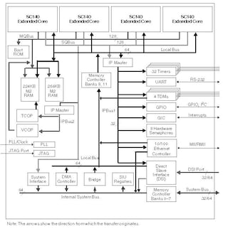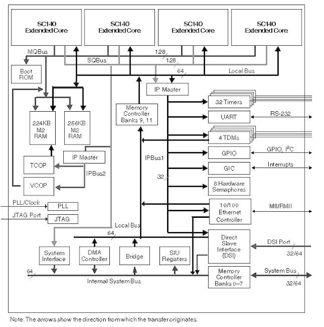 Each core has four arithmetic logic units (ALUs), internal memory, a write buffer, and two interrupt controllers. The MSC8126 targets high-bandwidth highly computational DSP applications and is optimized for wireless transcoding and packet telephony as well as high-bandwidth base station applications. The MSC8126 delivers enhanced performance while maintaining low power dissipation and greatly reduces system cost.