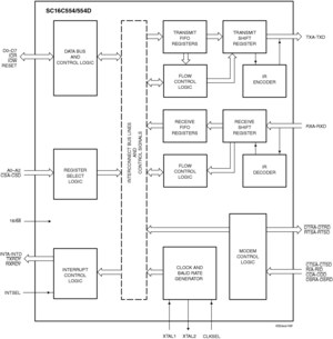 The SC16C554/554D is a 4-channel Universal Asynchronous Receiver and Transmitter (QUART) used for serial data communications. Its principal function is to convert parallel data into serial data and vice versa. The UART can handle serial data rates up to 5 Mbit/s. It comes with an Intel or Motorola interface.