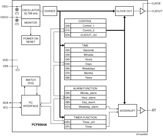 The PCF8564A is a CMOS real-time clock and calendar optimized for low power consumption. A programmable clock output, interrupt output and voltage low detector are also provided. All addresses and data are transferred serially via a two-line bidirectional I²C-bus. Maximum bus speed is 400 kbit/s. The built-in word address register is incremented automatically after each written or read data byte.