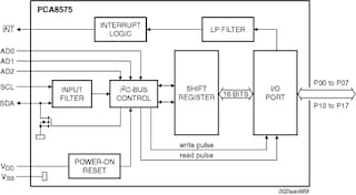 The PCA8575 also possesses an interrupt line (INT) which can be connected to the interrupt logic of the microcontroller. By sending an interrupt signal on this line, the remote I/O can inform the microcontroller if there is incoming data on its ports without having to communicate via the I²C-bus. The internal Power-On Reset (POR) initializes the I/Os as inputs.