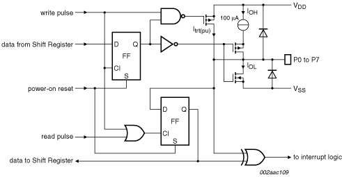 The devices consist of eight quasi-bidirectional ports, 400 kHz I²C‑bus interface, three hardware address inputs and interrupt output operating between 2.3 V and 5.5 V. The quasi-bidirectional port can be independently assigned as an input to monitor interrupt status or keypads, or as an output to activate indicator devices such as LEDs. The system controller can read from the input port or write to the output port through a single register.